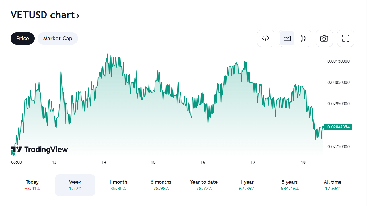 VeChain (VET) son zamanlarda önemli büyüme potansiyeliyle dikkat çekti. Platform, Ekim ayının en düşük seviyesinden bu yana %80’lik bir artış gördü ve bu da yükseliş eğilimine işaret ediyor. Bu büyüme, VeChain’in (VET) önemli gerçek dünya uygulamalarına sahip bir niş olan dağıtılmış defter teknolojisi aracılığıyla tedarik zinciri yönetimini kolaylaştırmaya odaklanmasına bağlanıyor. VeChain (VET) fiyatı, kripto pazarındaki genel eğilimleri yansıtan dikkate değer bir dalgalanma gösterdi. Para birimi yılın başında kayda değer bir yükseliş yaşadı, ardından bir düşüş dönemi izledi.