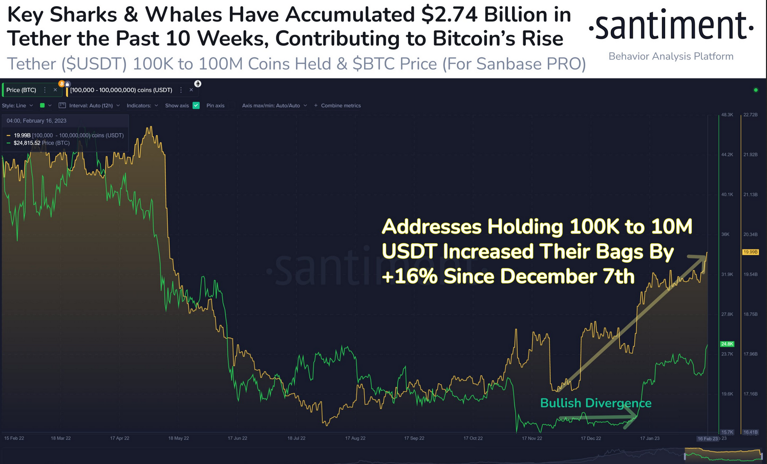 Bitcoin Neden Yükseldi?Kripto Paralar Ne Olur? Bitcoin Neden Yükseldi? Birçok analistin piyasaya dair tahminleri bulunuyor ve çoğu kendi iyimserlikleri veya korkularını yansıtıyor. Ancak rakamlar gerçek ve Bitcoin’in neden yükseldiğini anlamamız için on-chain verilere göz atmamız gerekiyor. En büyük on-chain analitik şirketlerinden olan Santiment bu soruya net bir cevap aldı. Santiment, önemli köpekbalığı ve balina adreslerinin son 10 hafta içinde hızlı bir şekilde 2,74 milyar dolarlık Tether biriktirdiğini ve satın alma güçlerini %16 oranında artırdığını söylüyor.
