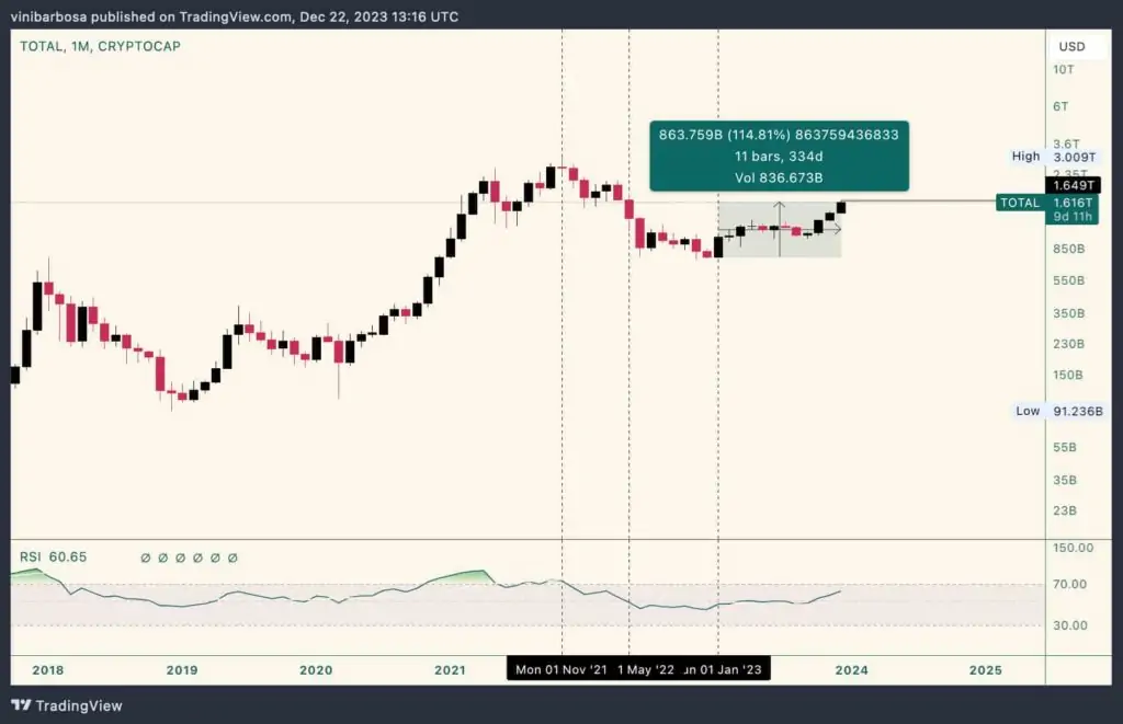 Mevcut boğa piyasası 2023 Ocak’ta ilk işaretlerini verdi. Yıl sonuna gelirken toplam piyasa değerinde %115’lik bir artışa tanık olduk. Daha önce, TradingView’in toplam kapitalizasyon endeksi 18 ay önce, 2022 Mayıs ayı piyasası sırasında mevcut değerini kaybetmişti.